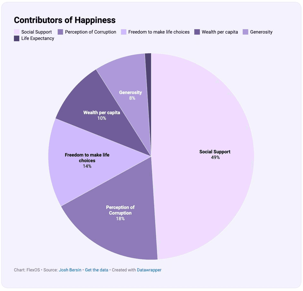 An analysis by Oxford scientists, highlighted in a visual below from FlexOS founder and CEO Daan van Rossum demonstrates that half of country-level happiness has been attributed to social support. One-half. This reveals the monumental role that community and social connections – manifested through practices like hygge and fika – play in elevating national happiness. Fostering social bonds isn’t just beneficial; it’s a key ingredient to a nation’s overall sense of well-being.